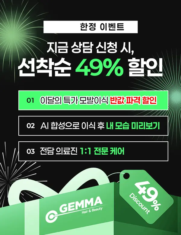 탈모 환자들 사이에서 입소문을 모으고 있는 젬마의원이 10월 한정 특별 이벤트를 진행한다. 이번 행사에서는 모발이식 단가를 기존 천 모당 199만원에서 99만원으로 대폭 인하해 환자들의 부담을 줄였다. 또한 상담 신청자 전원에게는 AI 합성 프로그램을 통한 시술 후 예상 모습 비교 서비스와 전담 의료진의 1:1 전문 케어가 제공된다.